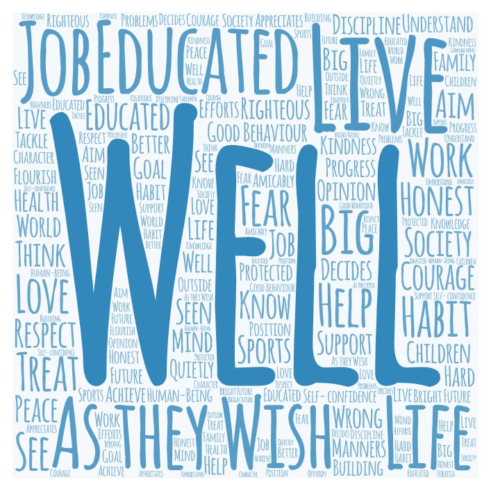 As the word cloud depicts most of the parents just wish their children would, “Live well”. We need a deeper discussion around this. Other responses include, “Study well”, should have Panbu, Ozhukam (Kindness, good behaviour) and be honest.